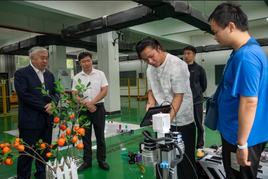 当天上午11时,陈学庚一行来到我校机械工程学院调研指导,实地考察了学院在丘陵山地农机装备、机甲机器人及农机材料等方面的教学与科研成果,并与师生代表进行交流。陈学庚对学院在本科生创新能力培养方面取得的成效表示肯定,表示“同学们动手能力强,在本科阶段就能取得这样的成果实属不易”。他建议学院进一步深化产教融合,主动对接企业需求,推动科研成果转化,培养更多适应区域经济社会发展的高素质应用型人才。